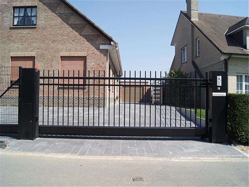 De toegang is voorzien van een vrijdragende schuifpoort. Motorisatie is ingebouwt in de kolom voor een extra berscherming.